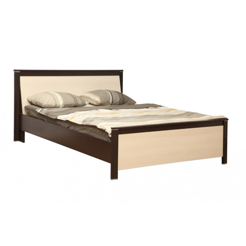 Кровать двуспальная с оригинальным дизайном. Поверхность изголовья слегка наклонена относительно основной конструкции. Спинки эффектно обрамлены опорами и верхними планками в более тёмной цветовой гамме. Небольшие декоративные элементы по углам подчёркивают эстетику дизайна. Боковые панели гармонично сочетаются с цветом опор. Поверхность пола открыта.