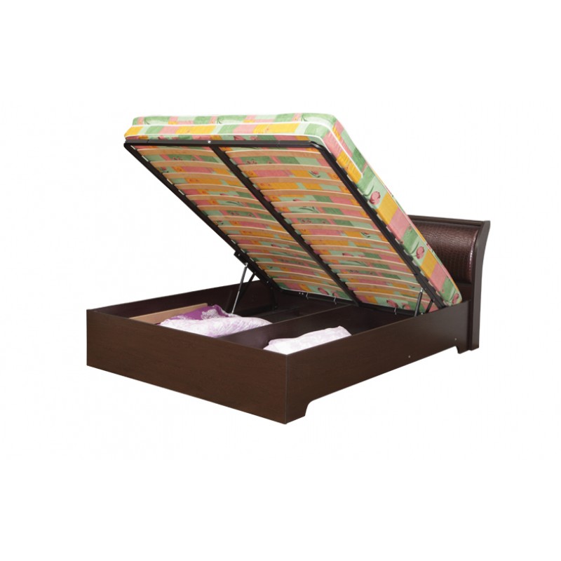 Двуспальная кровать выполнена в приятной цветовой гамме, напоминающей шоколад. В отделке фасадов использован текстурный материал, ассоциирующийся с крокодиловой кожей. Изголовье кровати обладает изогнутой формой и обеспечивает удобство в положении полусидя. Изножье с боковинами формируют цельную раму. В нижней части выполнен фигурный вырез, обеспечивающий доступ к поверхности пола. Основание представляет собой двухсекционную металлическую раму с множеством деревянных ламелей. Специальный механизм подъёма позволяет легко откидывать основание с целью доступа к коробу. Две секции, предназначенные для хранения постельных принадлежностей, вмещают значительное количество объёмных вещей.
