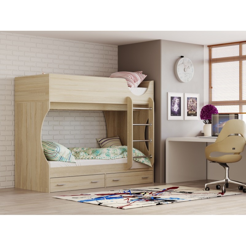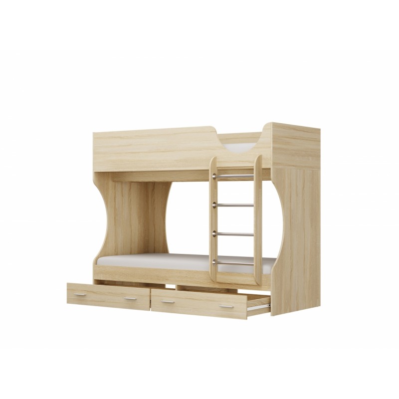 Двухъярусная кровать Д 2 – компактный вариант спального места для двоих детей. Имеет два полноценных спальных места размером 80х190 см. Кровать изготавливается в двух цветовых решениях: Ясень Шимо темный/Ясень Шимо светлый и Дуб Сонома. Есть два больших бельевых ящика. Кровать может собираться как с правым, так и с левым входом.