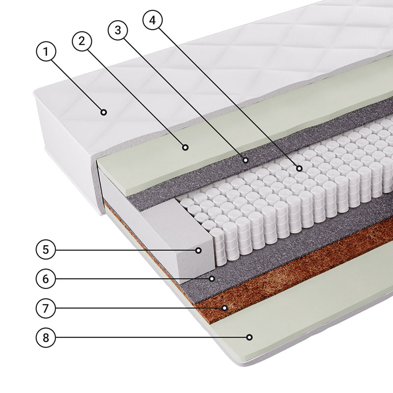 Кокосовая койра - 100% натуральный материал с уникальными свойствами. Койра, скрепленная натуральным латексом, дает объемную упругую воздухопроницаемую структуру. Такой материал используется в моделях, предназначенных для любителей более жесткого и упругого спального места. Естественные вентиляционные качества, эластичность, прочность, упругость, гигиеничность и антиаллергенность, наряду с очень долгим сроком службы, делают этот материал идеальным для наполнения матраса.