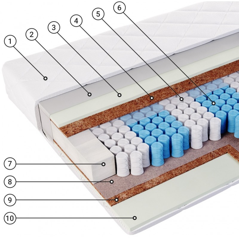 Кокосовая койра - 100% натуральный материал с уникальными свойствами. Койра, скрепленная натуральным латексом, дает объемную упругую воздухопроницаемую структуру. Такой материал используется в моделях, предназначенных для любителей более жесткого и упругого спального места. Естественные вентиляционные качества, эластичность, прочность, упругость, гигиеничность и антиаллергенность, наряду с очень долгим сроком службы, делают этот материал идеальным для наполнения матраса.