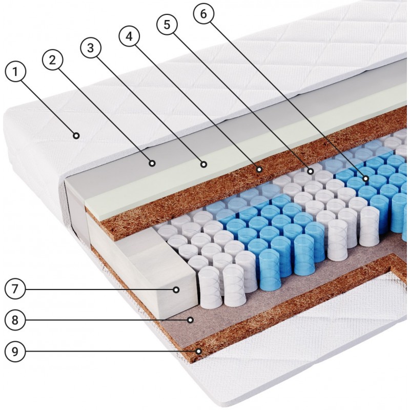 Кокосовая койра - 100% натуральный материал с уникальными свойствами. Койра, скрепленная натуральным латексом, дает объемную упругую воздухопроницаемую структуру. Такой материал используется в моделях, предназначенных для любителей более жесткого и упругого спального места. Естественные вентиляционные качества, эластичность, прочность, упругость, гигиеничность и антиаллергенность, наряду с очень долгим сроком службы, делают этот материал идеальным для наполнения матраса.