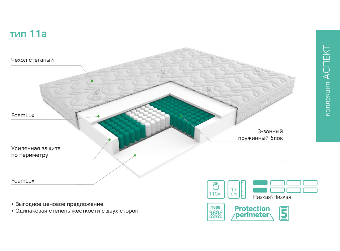 Матрас с 3-х зональным блоком пружин и одинаковыми по жёсткости сторонами подарит здоровый сон. Плотная пена FoamLux подарит дополнительную упругость и комфорт.